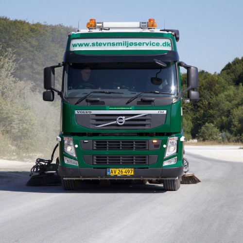 Vores fejebiler er en Volvo FM330 med Beam S9000 fejeaggregat, rotorclean højtryksaggregat og højtrykslanse samt en Scania 94 P220 med Bucher Schörling Optifant 70 fejeaggregat.