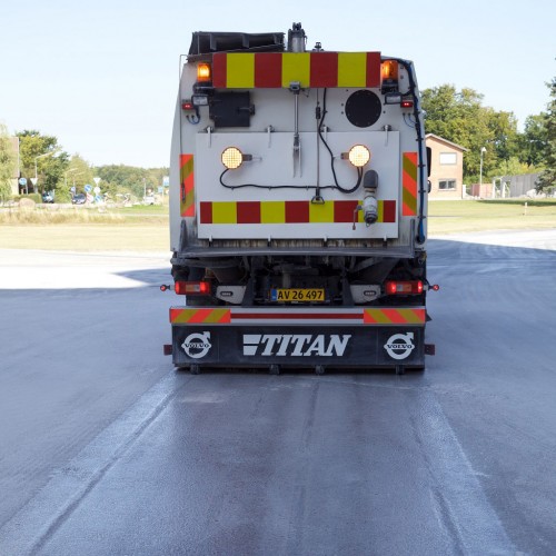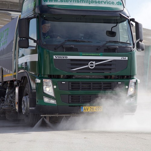 På ekstra beskidte veje, hvor jord og snavs sidder godt fast, sætter vi tryk på vandet og rykker ud med vores Volvo-lastbil med højtryksrenser.